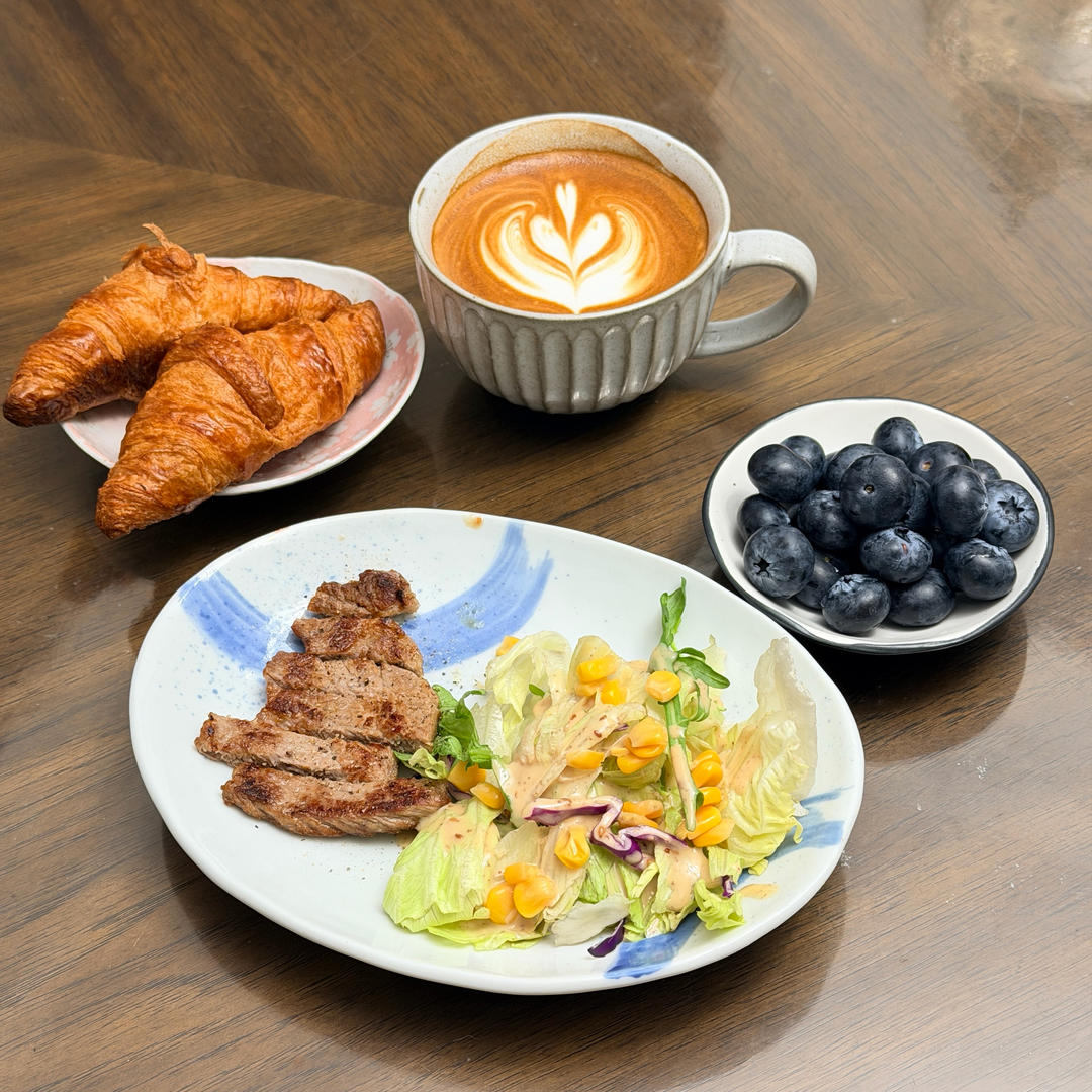 牛排 蔬菜沙拉 牛角面包