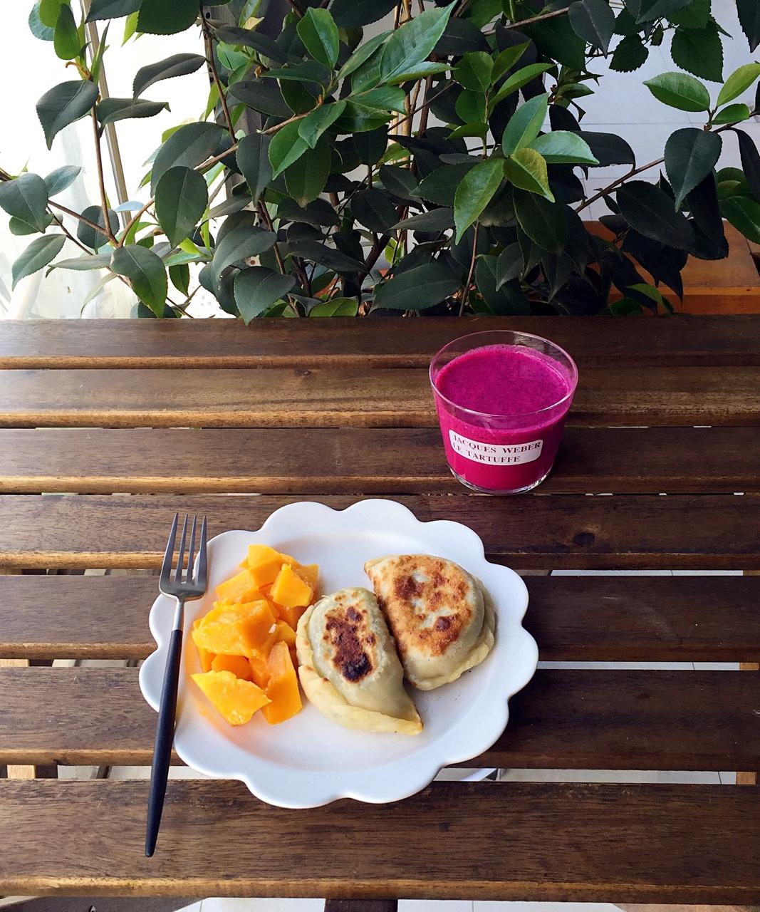 昨晚揉好面团,拌好内馅,早上起来包,再下锅煎,一边打个奶昔,半个小时也可以吃上...