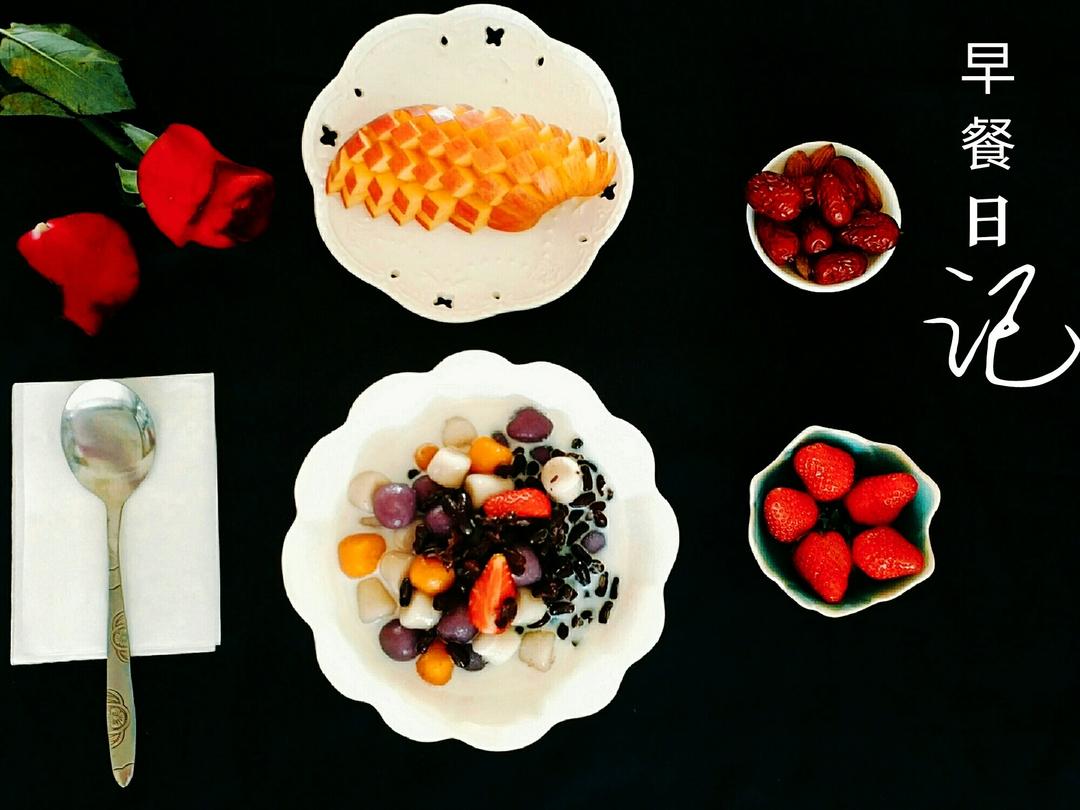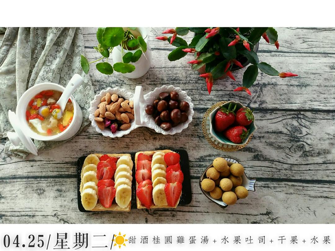 水果吐司+桂圆枸杞甜酒汤+干果+水果