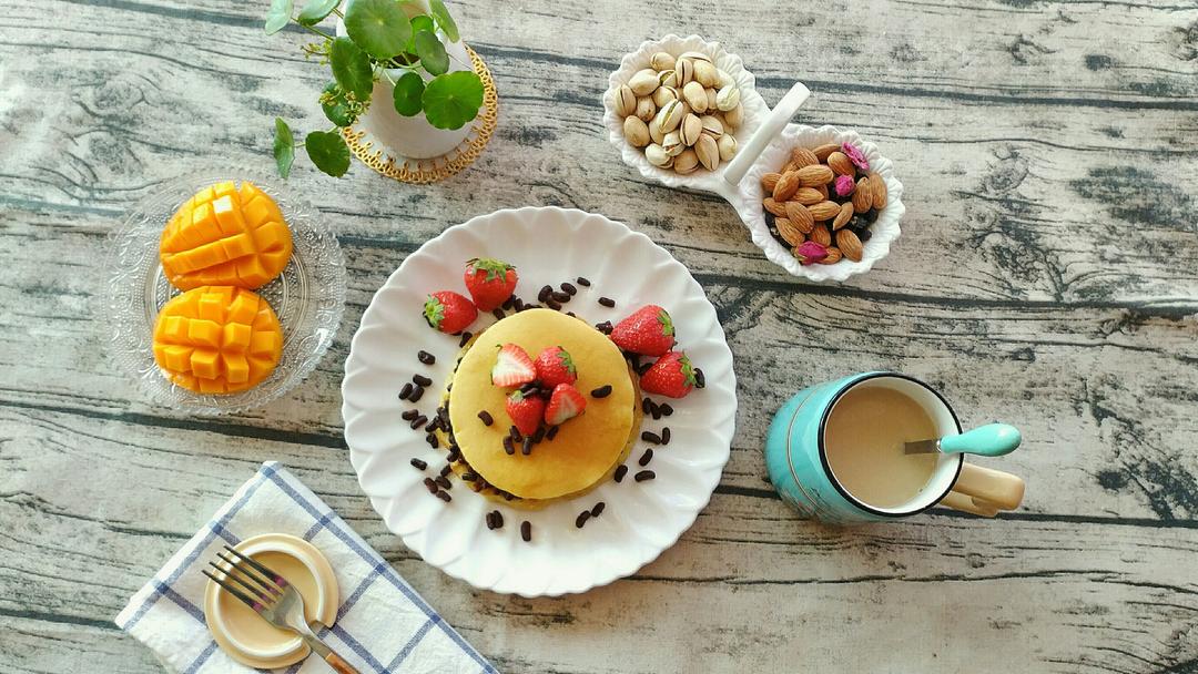 松饼夹红豆+芒果+奶茶+...