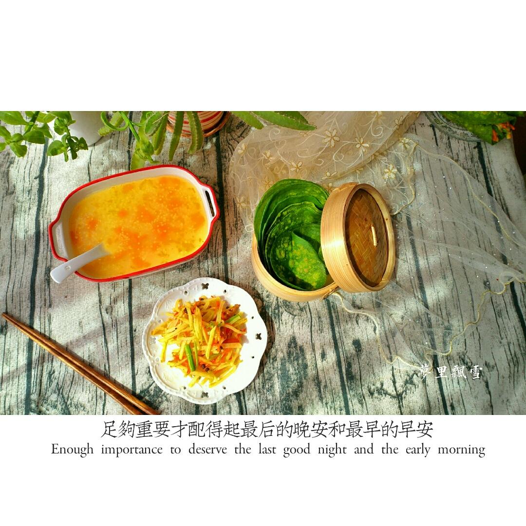 小米南瓜粥,菠菜卷饼,土豆丝。马拉松赛第一天!希望能坚持!加油!
