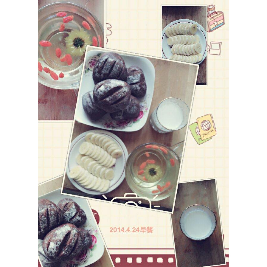 可可面包、香焦片、枸杞与菊花茶、牛奶,二个人的早餐。