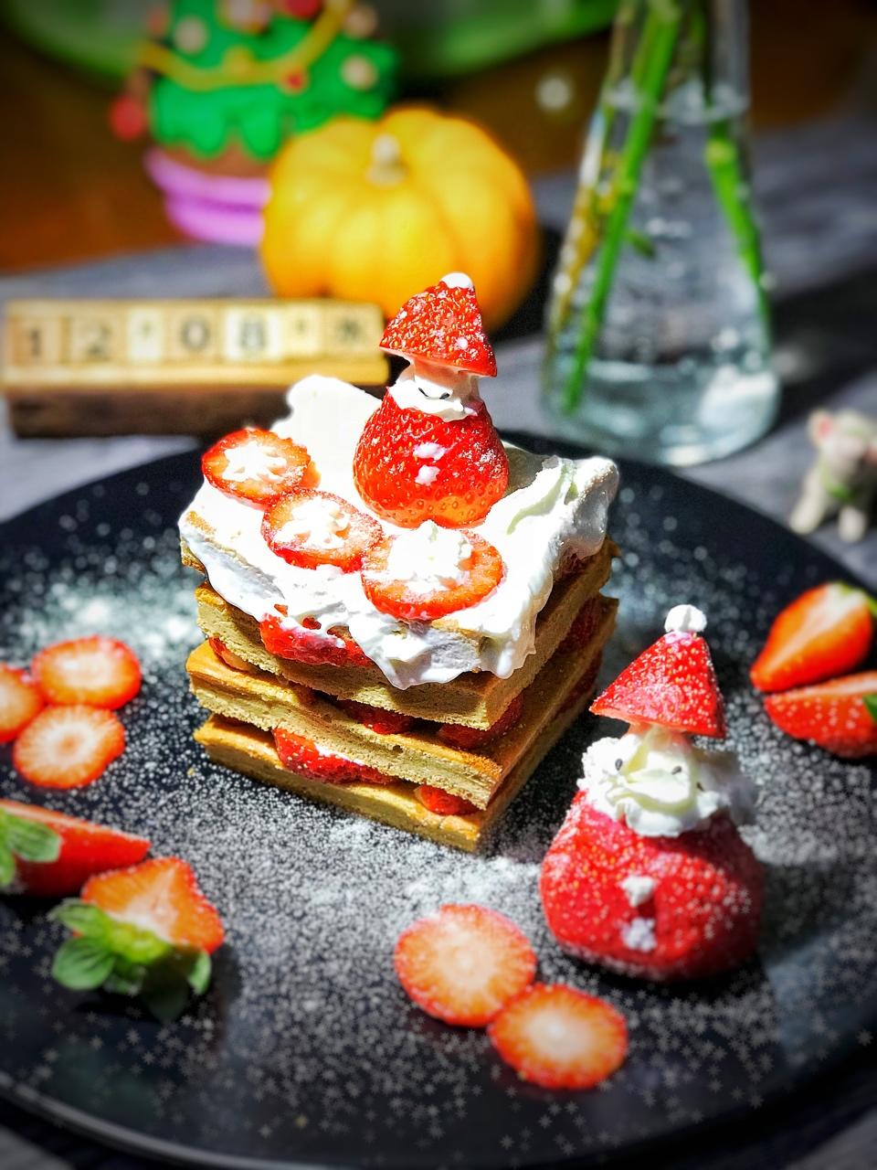 圣诞老人草莓蛋糕,桐哥自制的圣诞树音乐盒做衬景还是很有气氛滴