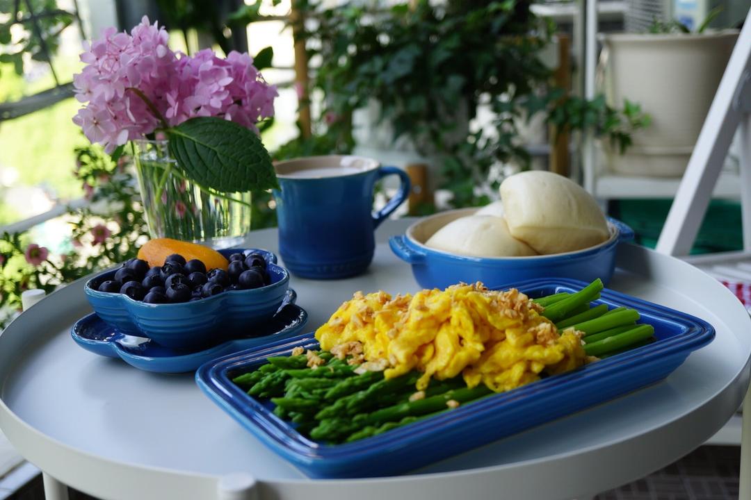 奶香馒头 炒鸡蛋 白灼芦笋 水果 牛奶