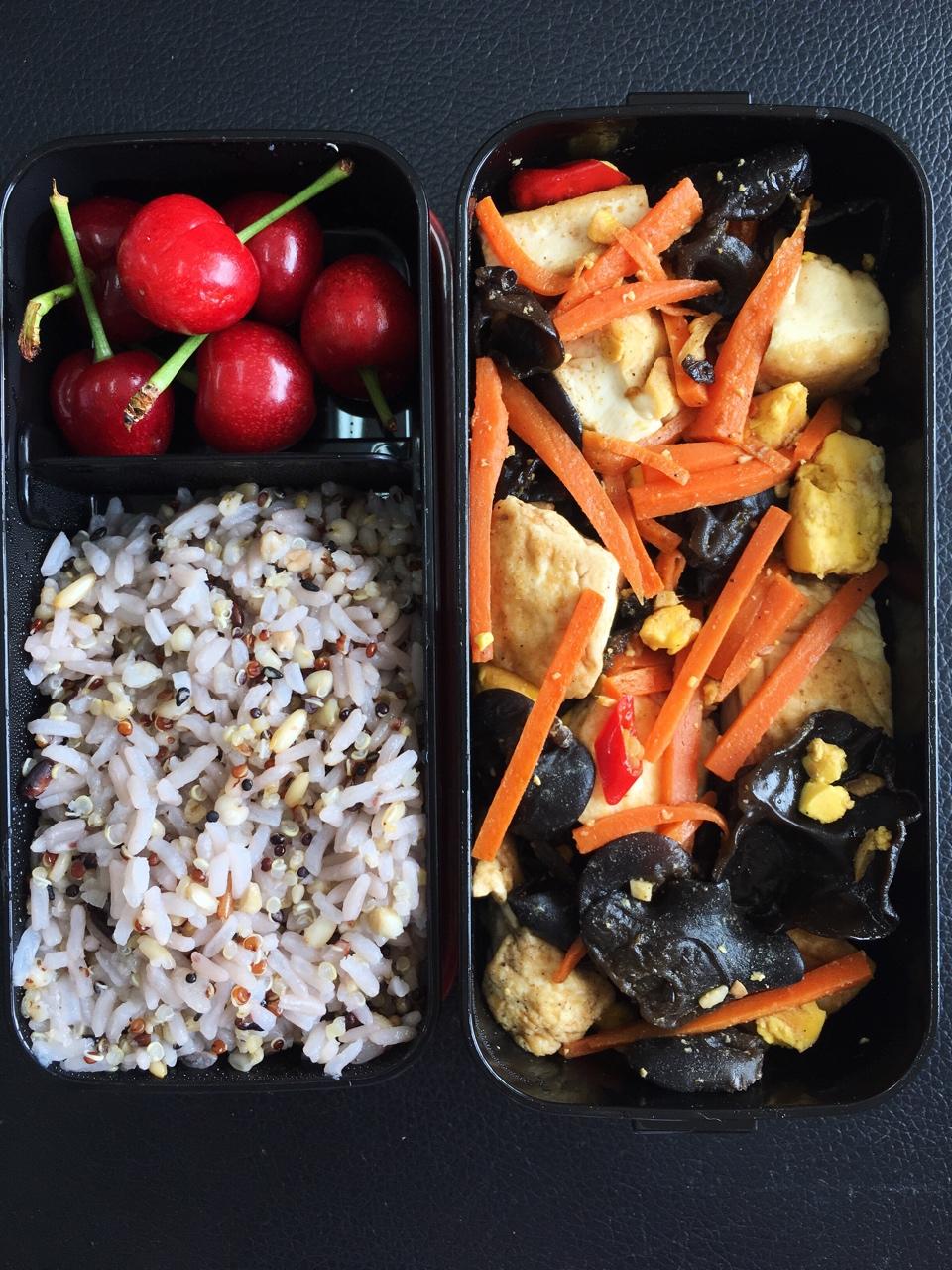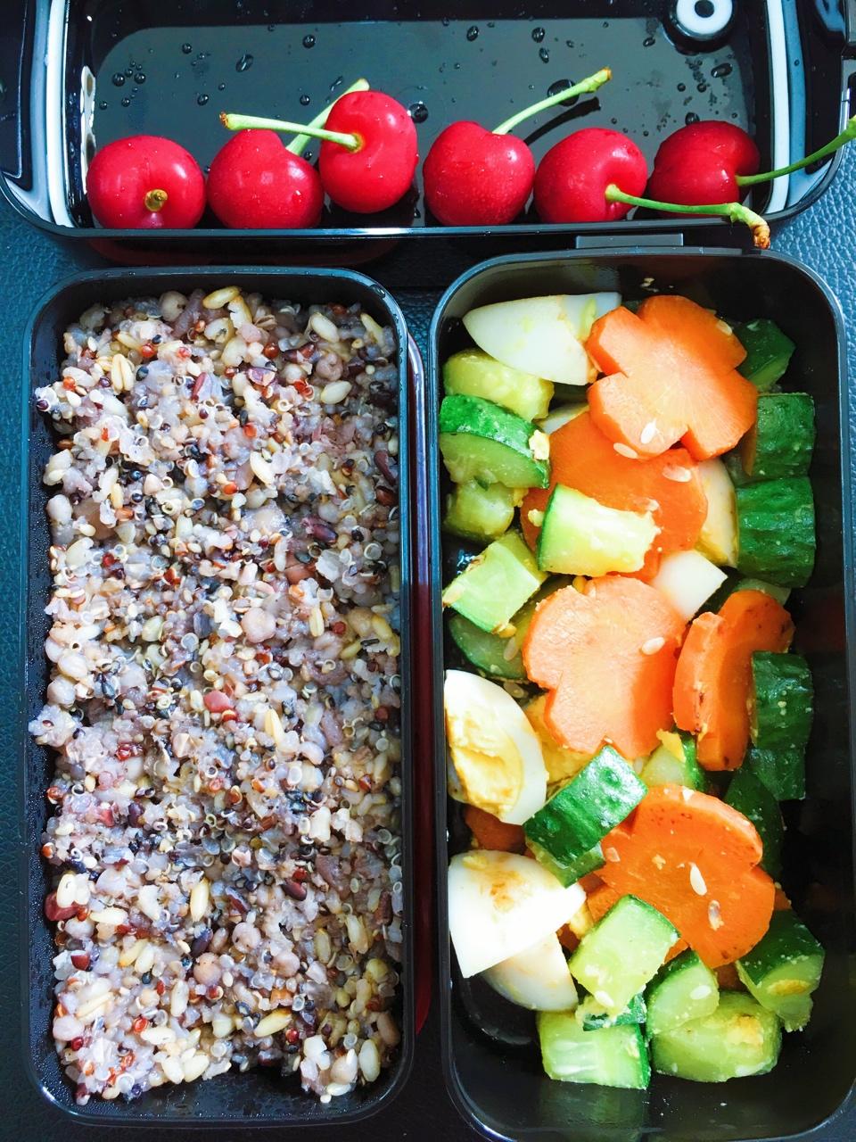 为了让减肥餐吃的更愉快,各种想啊,哈哈,杂粮饭,胡萝卜炒黄瓜,外加一个鸡蛋,热量不高,还饱饱哒~哦,樱桃季,必须吃樱桃呀...