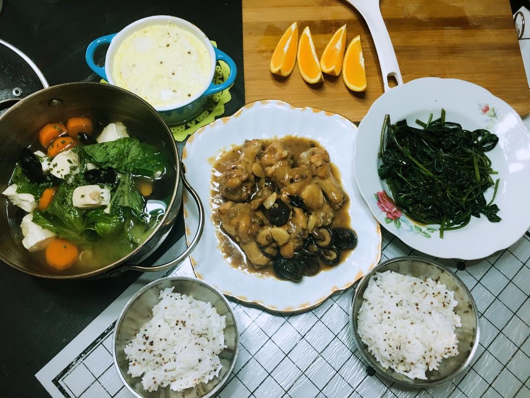 想不到自己也能整一桌午餐~很满足啊。藜麦饭用微波炉微的,鸡蛋豆腐羹放了低脂奶,用烤箱180度烤了25分钟左右,大锅烧鸡腿...