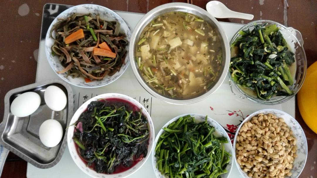 自家种的 苋菜 空心菜 苦马菜 酸菜黄豆 四季豆干 豆腐汤 一碗荞麦金针面 感恩所有的一切...