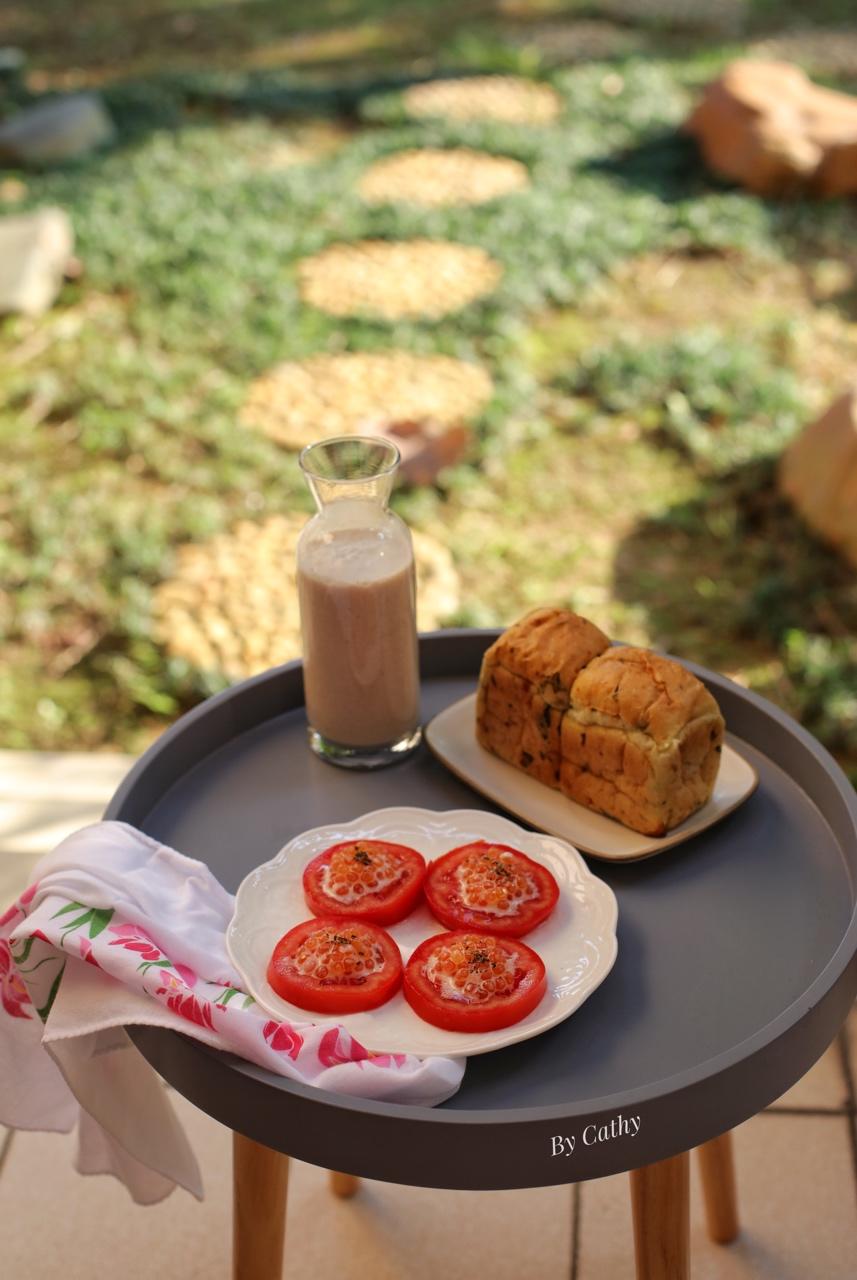 No.178 早餐打卡2017.05.28 “菠菜芝士小吐司”+“番茄鱼子酱沙拉”+“香蕉燕麦奶昔”...