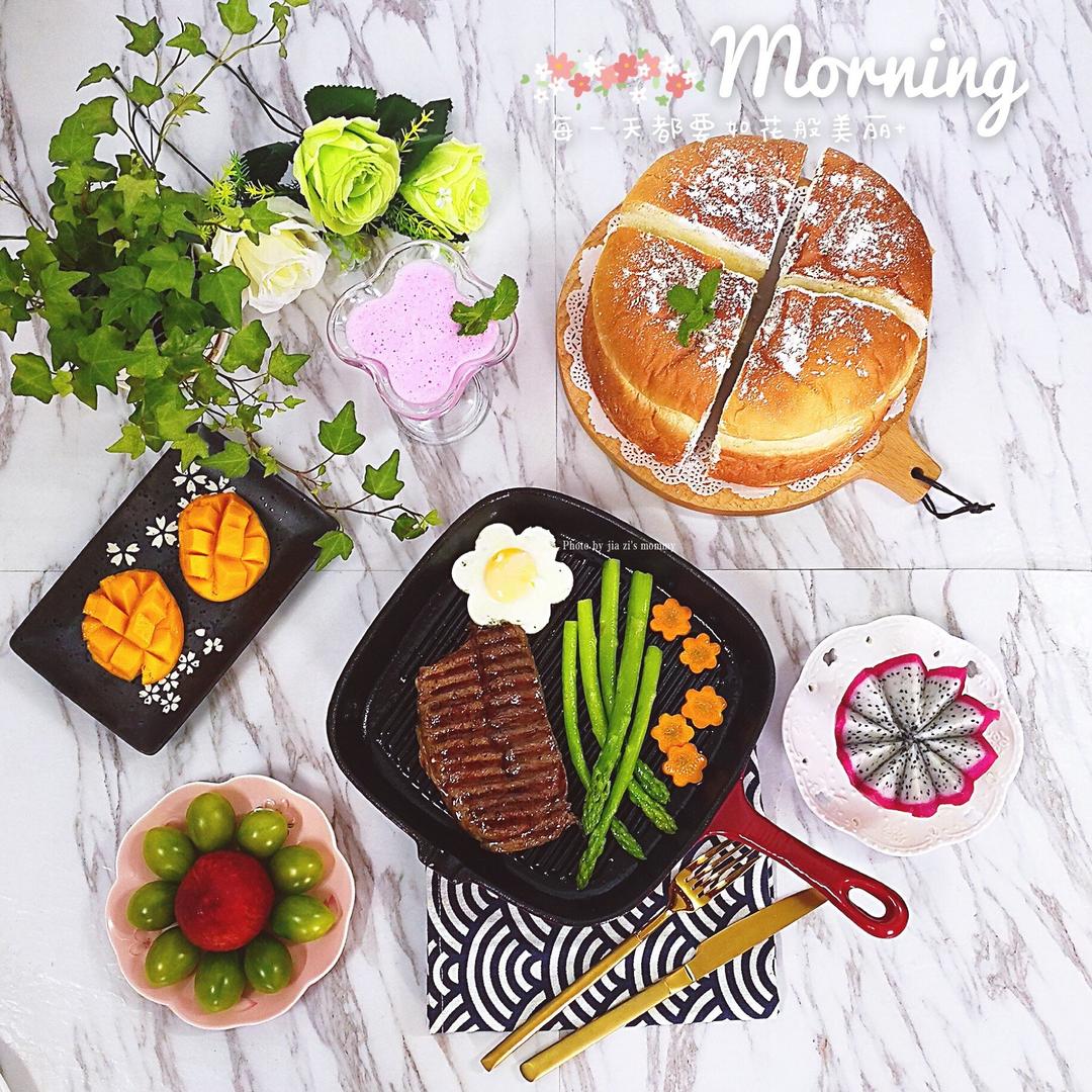 早餐有乳酪包,煎牛排芦笋花朵煮蛋,火龙果皮酸奶奶昔...