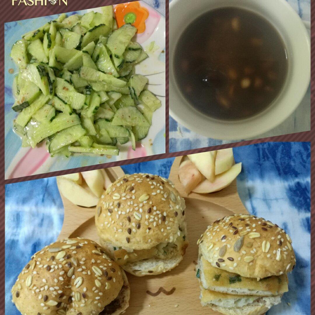 健康早餐--杂粮花生红豆粥,沙拉拌黄瓜,油饼汉堡包,巧克力酱汉堡包。水果---桃子