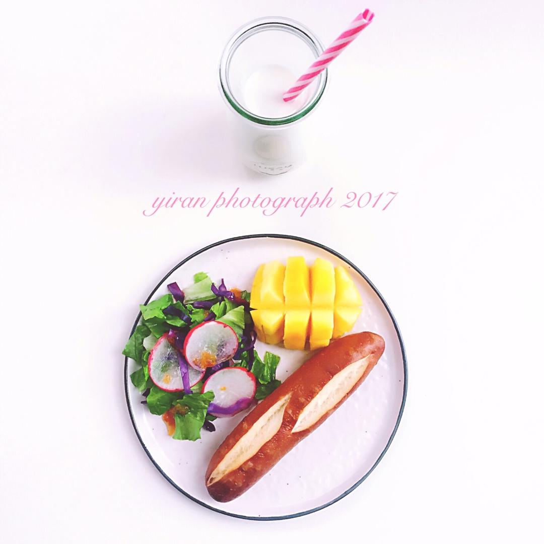 D218 早餐:碱水面包+生菜+芒果+牛奶