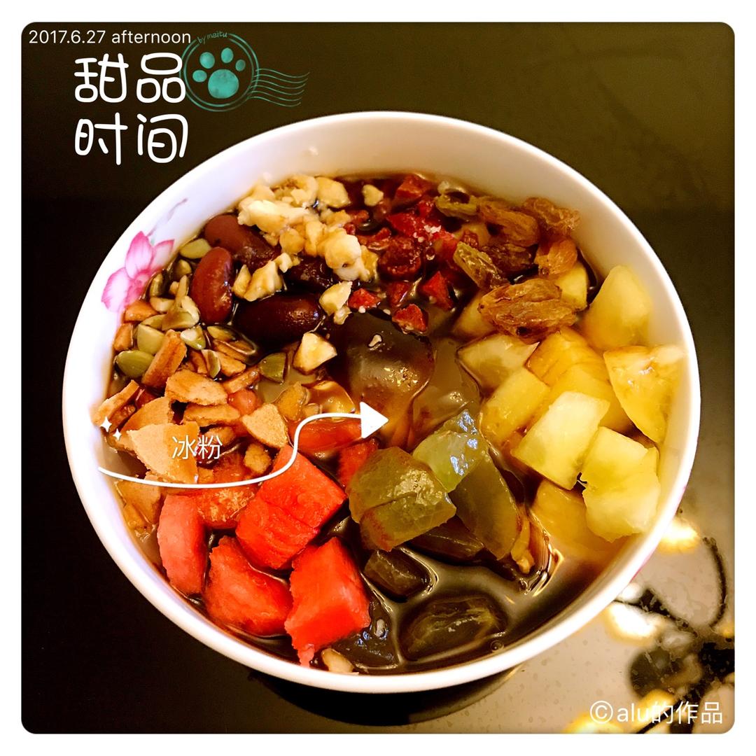 西瓜,葡萄,桃子,山楂片,葡萄干,草莓干,红芸豆,核桃仁,南瓜籽。红糖。