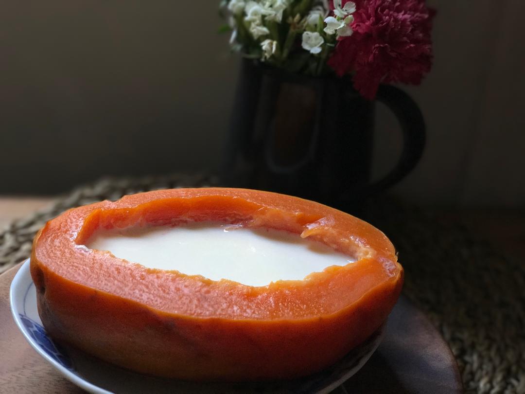 楼下邻居的一棵木瓜树上结了好多木瓜 邻居给送了两个来 做了木瓜炖牛奶 很好吃的