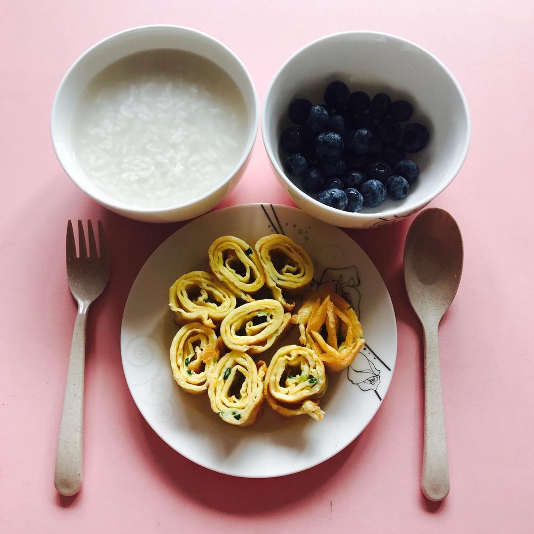白粥+蓝莓+鸡蛋卷