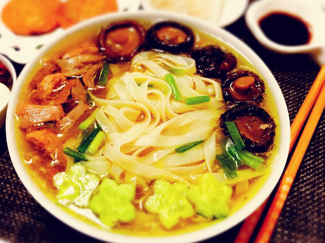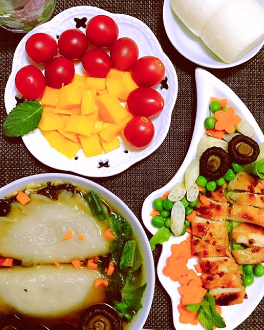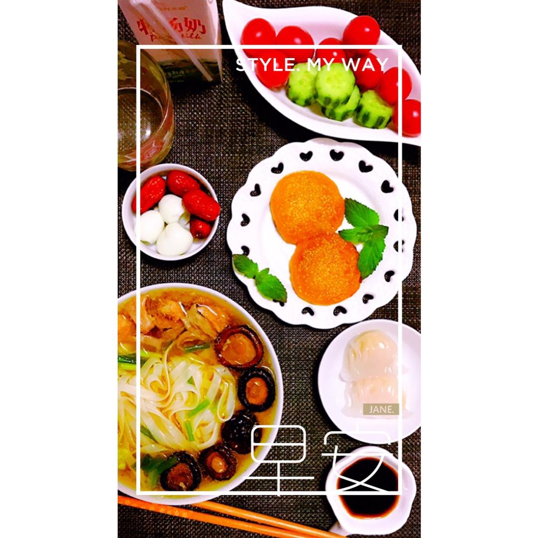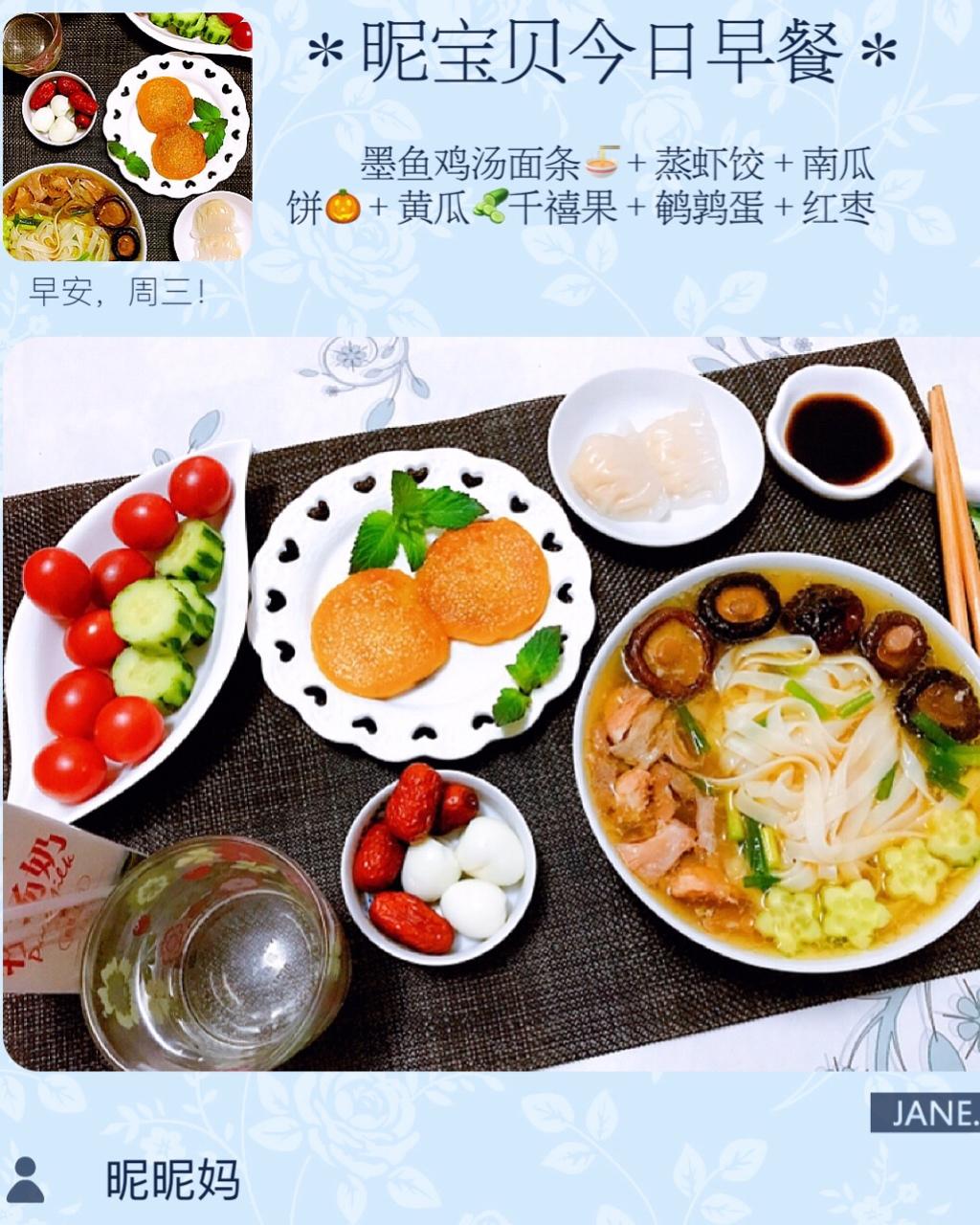 墨鱼鸡汤面🍜+蒸虾饺+南瓜饼🎃+鹌鹑蛋红枣+黄瓜🥒千禧果