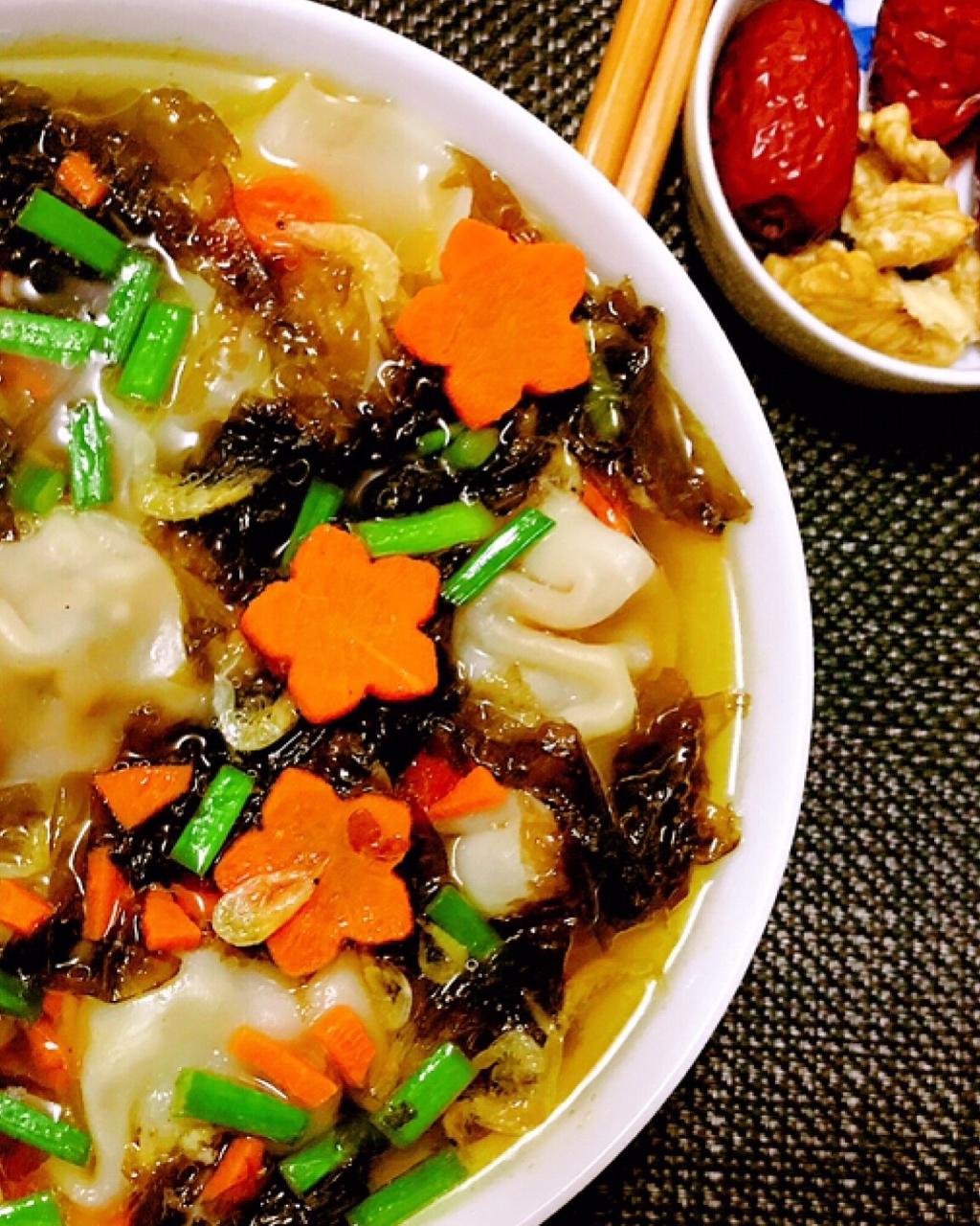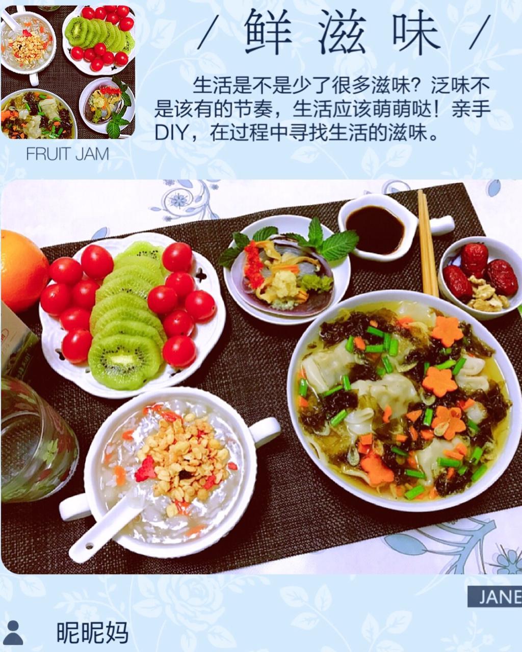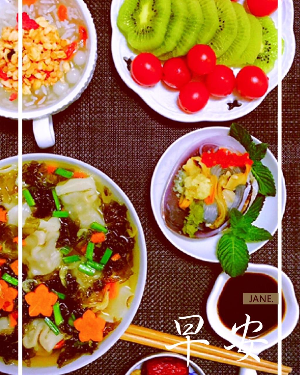 三鲜水饺+粉丝花蛤+米酒藕粉小汤圆+水果麦片+红枣核桃...