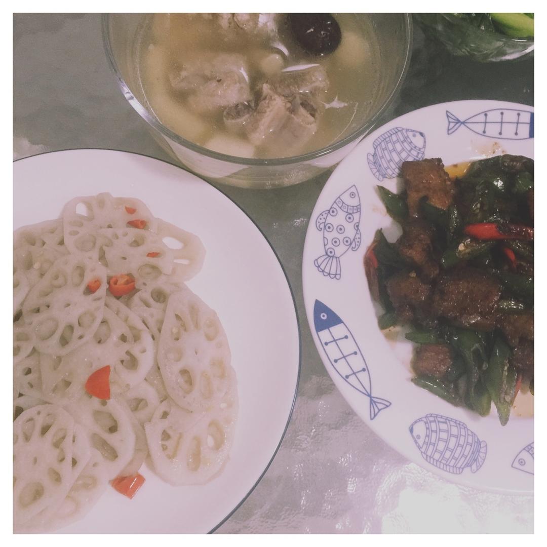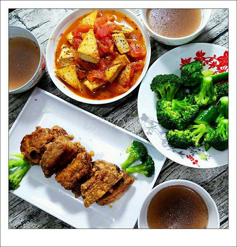 蒜香骨,番茄煮豆腐干,炒西兰花。