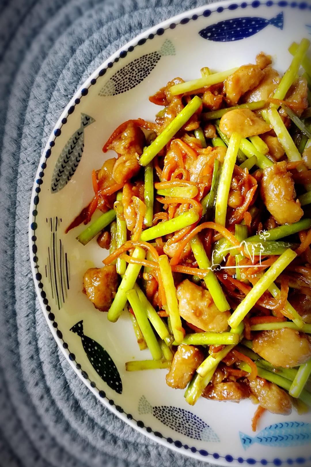 蒜苔胡萝卜炒鸡腿肉丁。米饭杀手,也是一道不折不扣的下饭菜呢😉😉!