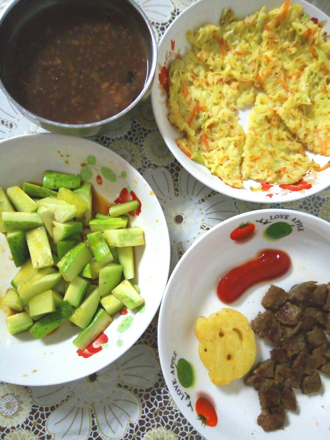 宝贝幼儿园开学了,根据孩子白天在幼儿园的饮食做晚餐!八宝粥,嫩瓜虾仁蛋饼,菲力牛排,小熊薯...