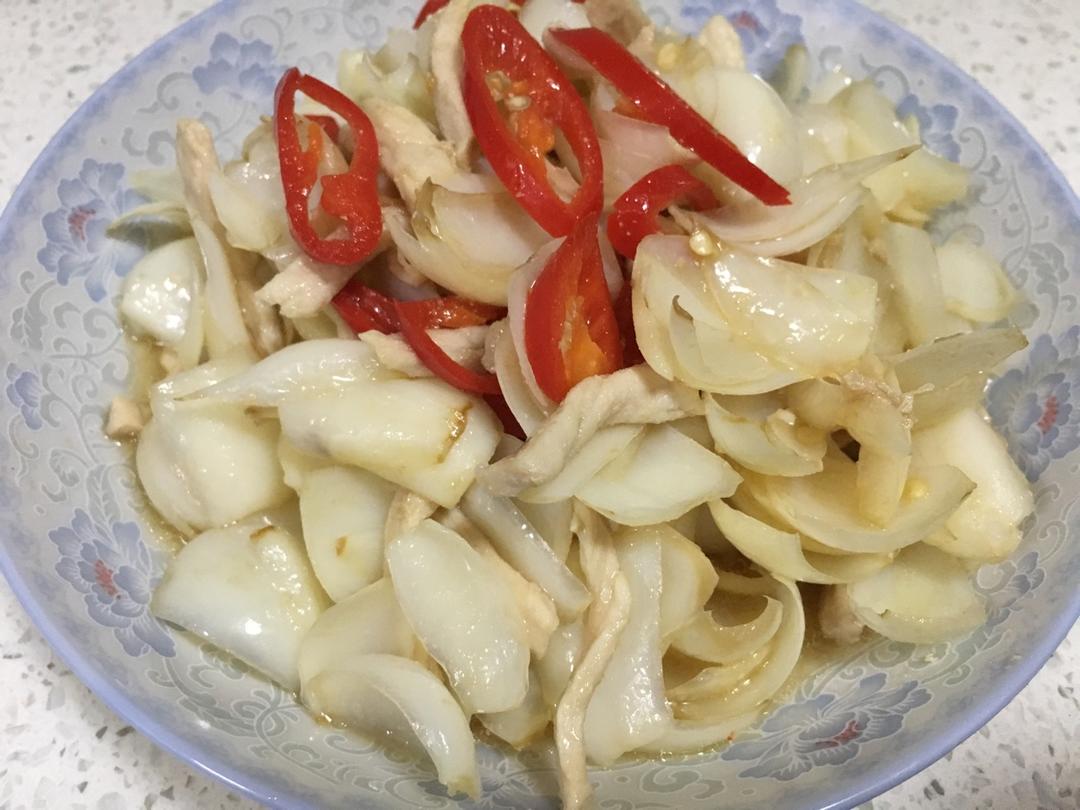 百合瘦肉清炒,新鲜百合的植物蛋白和瘦肉的动物蛋白完美结合,加点生抽和红椒提味上色,秋季养生佳肴。