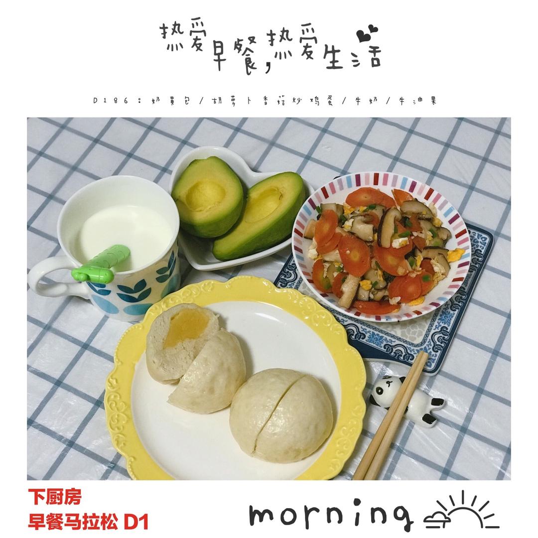D1:奶黄包/胡萝卜香菇炒鸡蛋/牛奶/牛油果