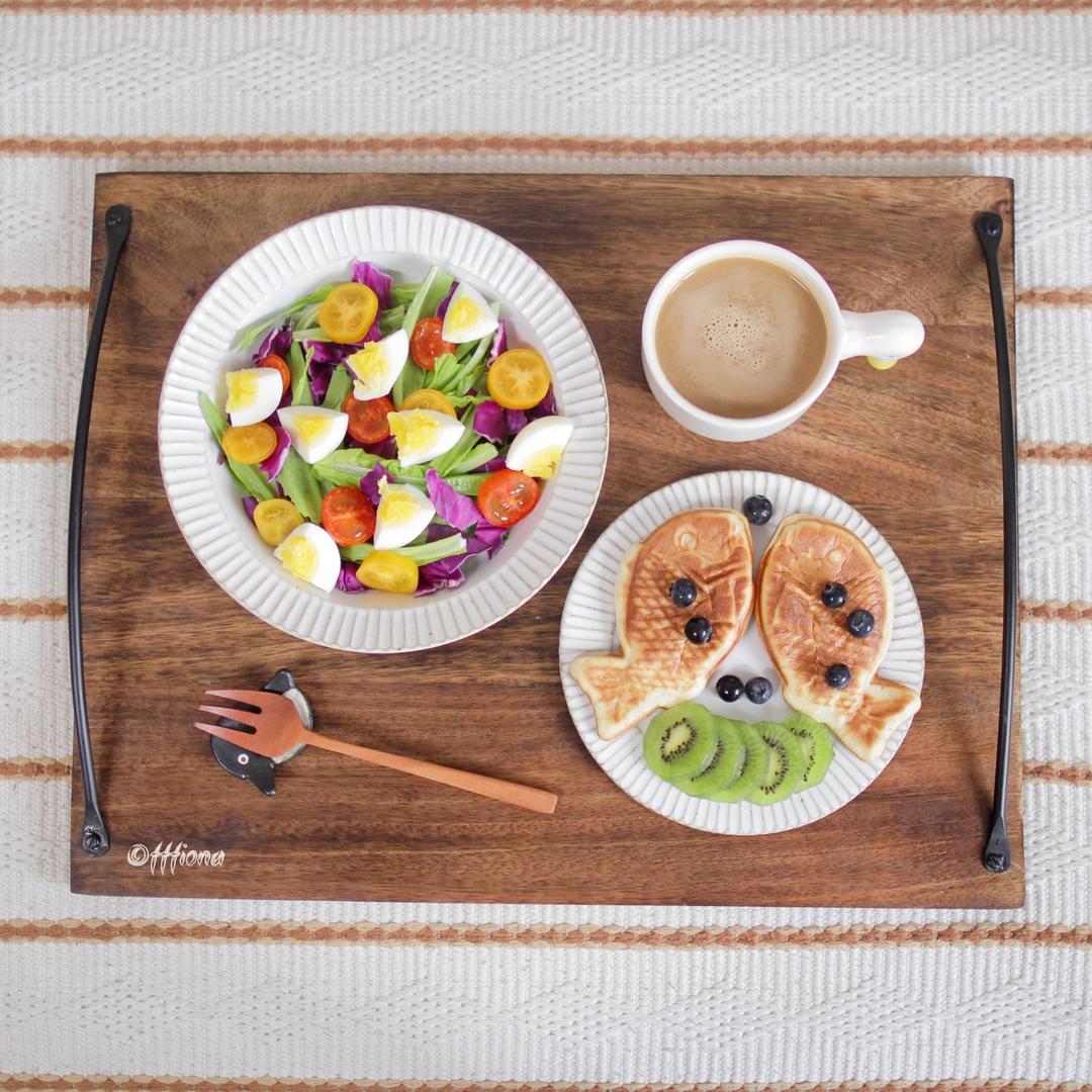 油醋汁鸡蛋沙拉+稠鱼烧和水果+拿铁