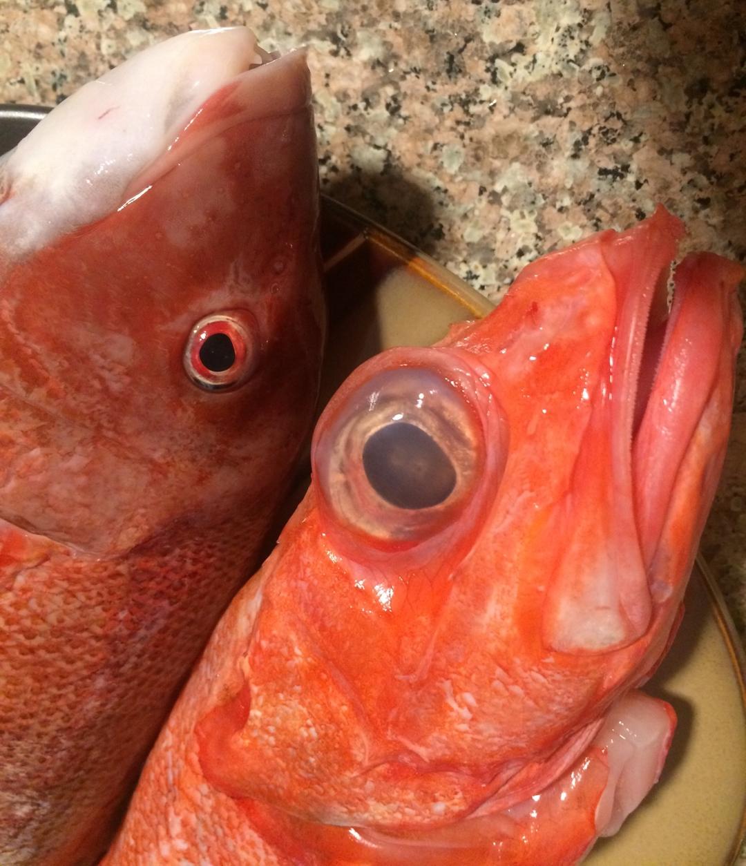 吃鱼喽!左边---美国红衣,右边大眼红鱼(俺叫它大眼怪鱼😁)大眼红鱼的眼睛那叫一个大,清蒸后眼珠子不小心掉了出来(见后面...