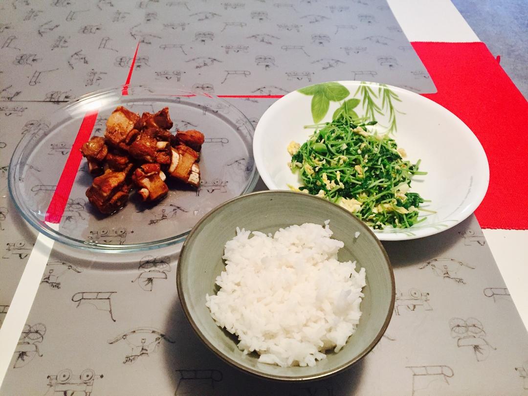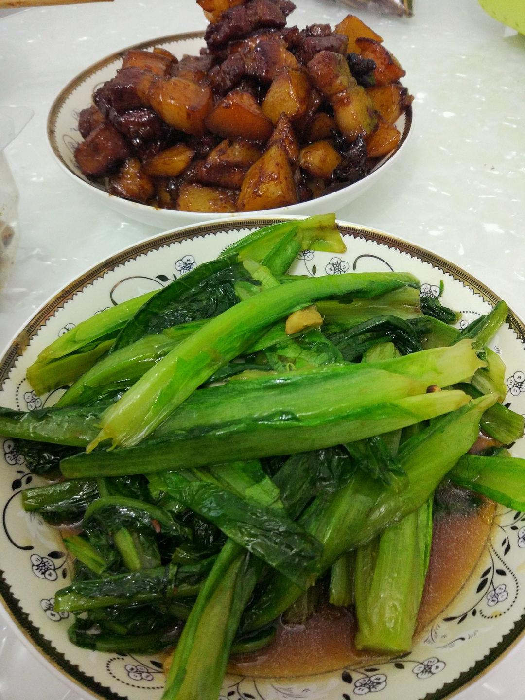 土豆红烧肉,炝炒油麦菜