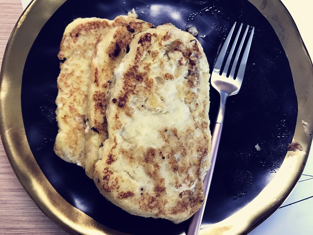 中午去同学那蹭吃的,这是她小时候她妈妈经常做的,将香蕉碎成泥倒入蛋液再裹上面包煎😋