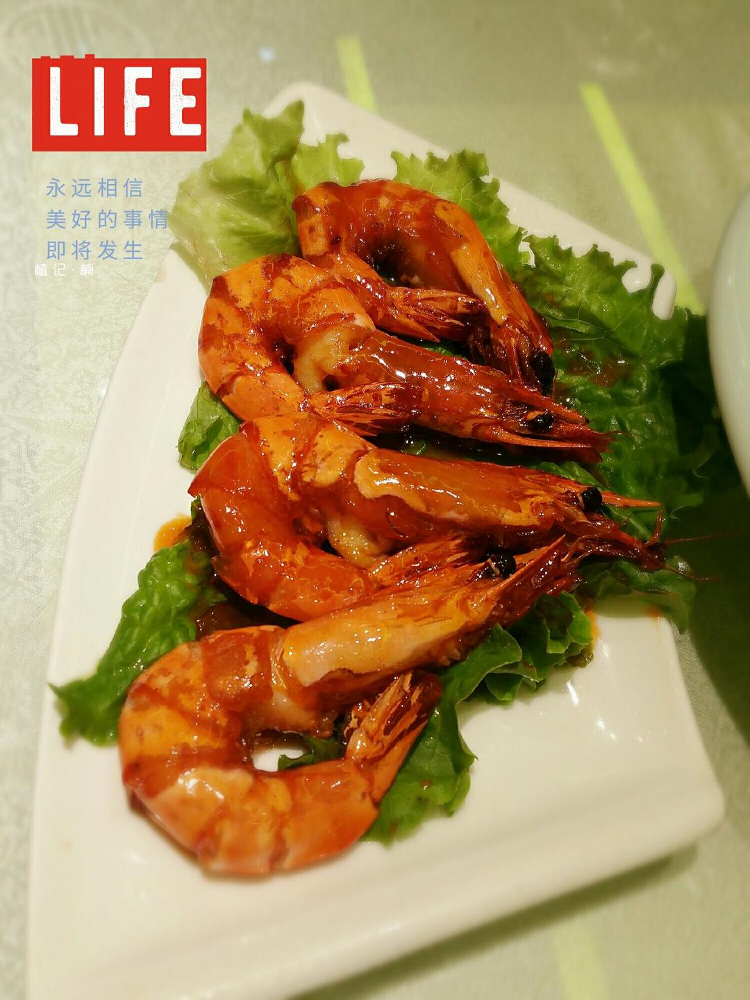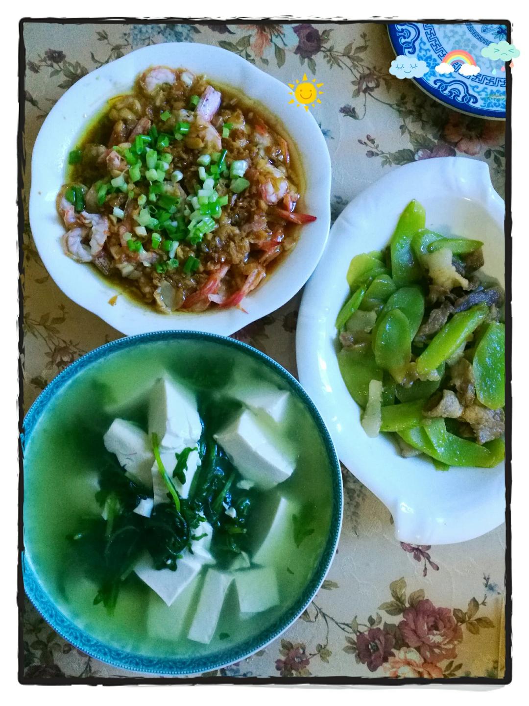 自制剁椒鱼头,蒜蓉蒸虾,莴苣炒肉片,茼蒿豆腐汤