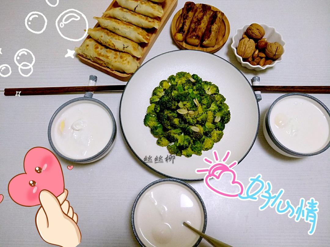 鸡蛋粉条木耳盒子,煎山药,荷包蛋芋圆大枣西米露,清炒西兰花,坚果。
