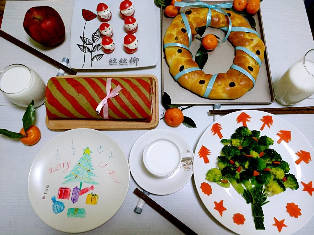 圣诞花环面包,圣诞蛋糕卷,西兰花圣诞树,圣女果圣诞老人,牛奶,苹果,沙糖桔...