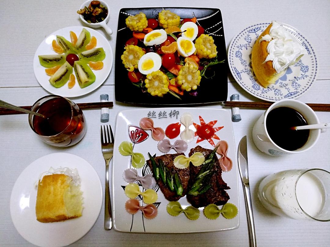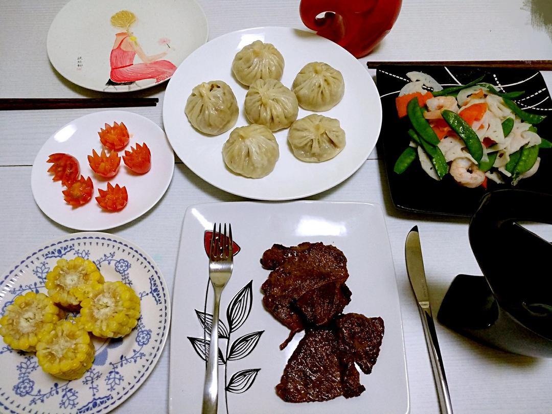 萝卜粉丝包,玉米,黑胡椒牛扒,荷塘小炒,圣女果...
