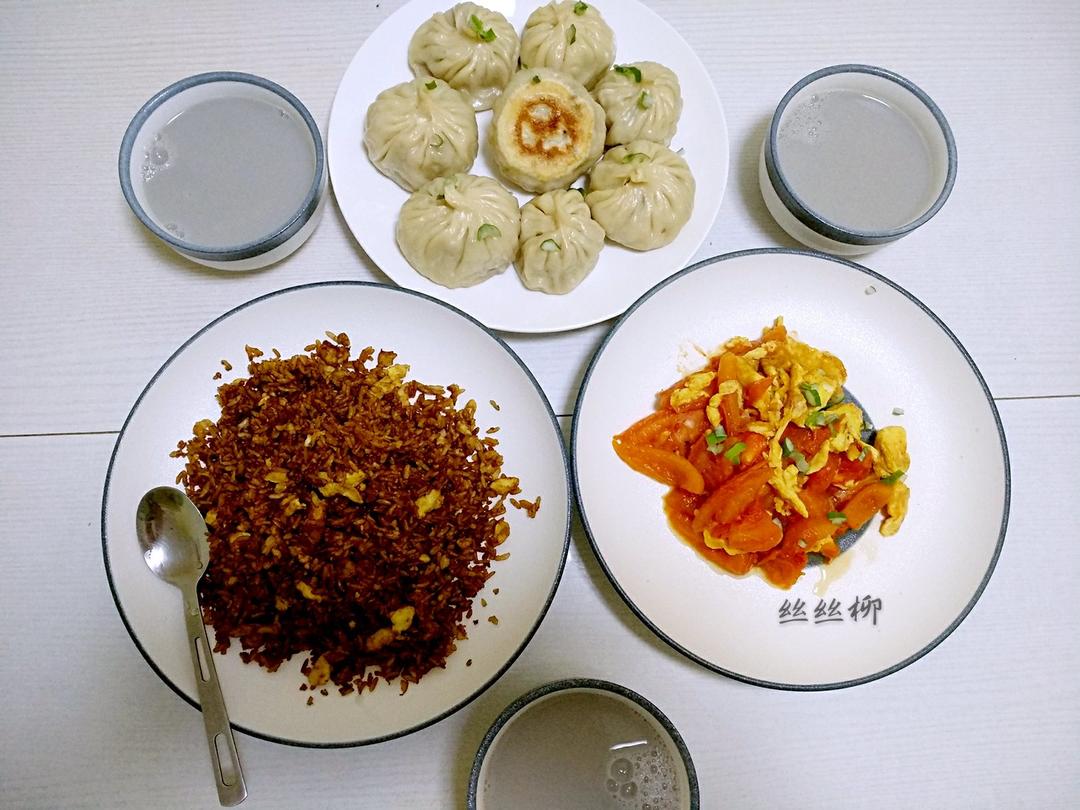 萝卜粉丝水煎包,酱油炒饭,番茄炒蛋,杂豆豆浆。