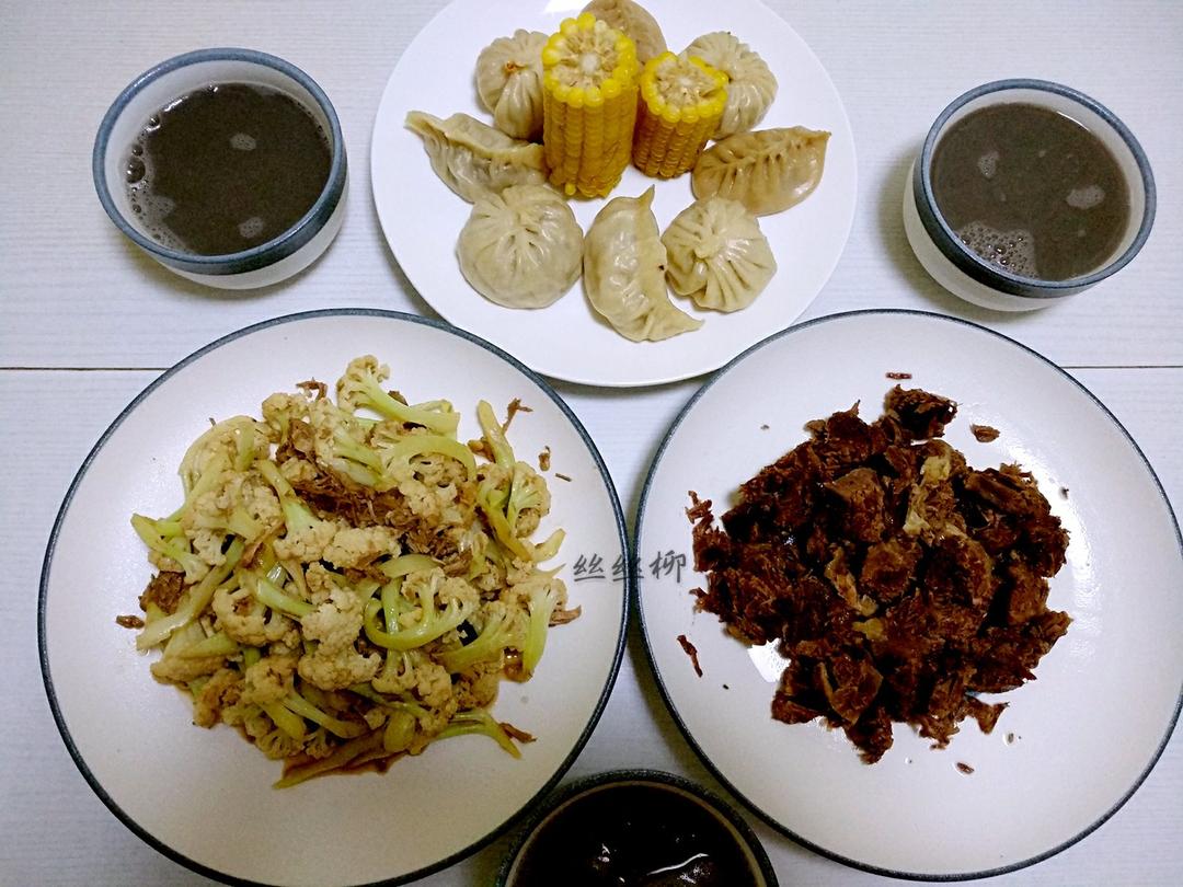 萝卜粉丝包&萝卜牛肉包,玉米,杂豆豆浆,肉末有机花菜,泉水牛肉(外食...