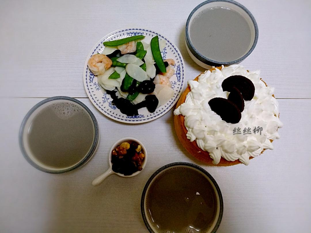 酸奶戚风奶酪蛋糕,荷兰豆炒山药片,黑豆豆浆,坚果。