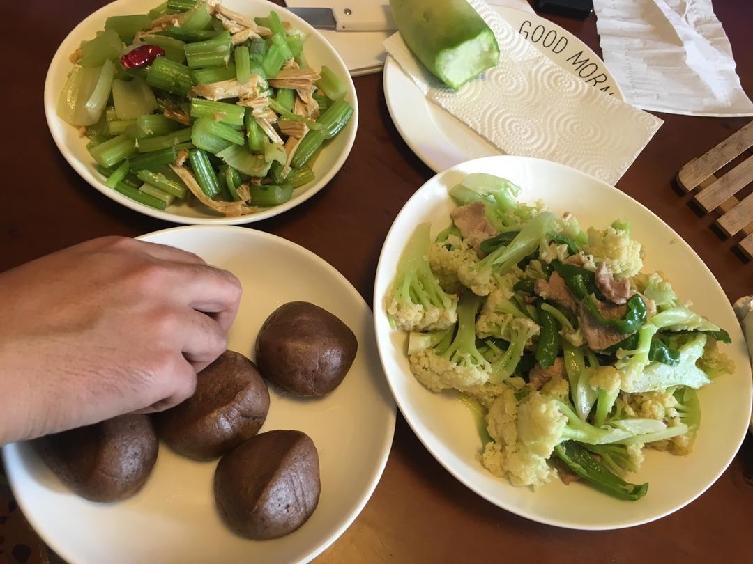 香菇青菜 鸡肉土豆片 芹菜牛肉丝 燕麦饭