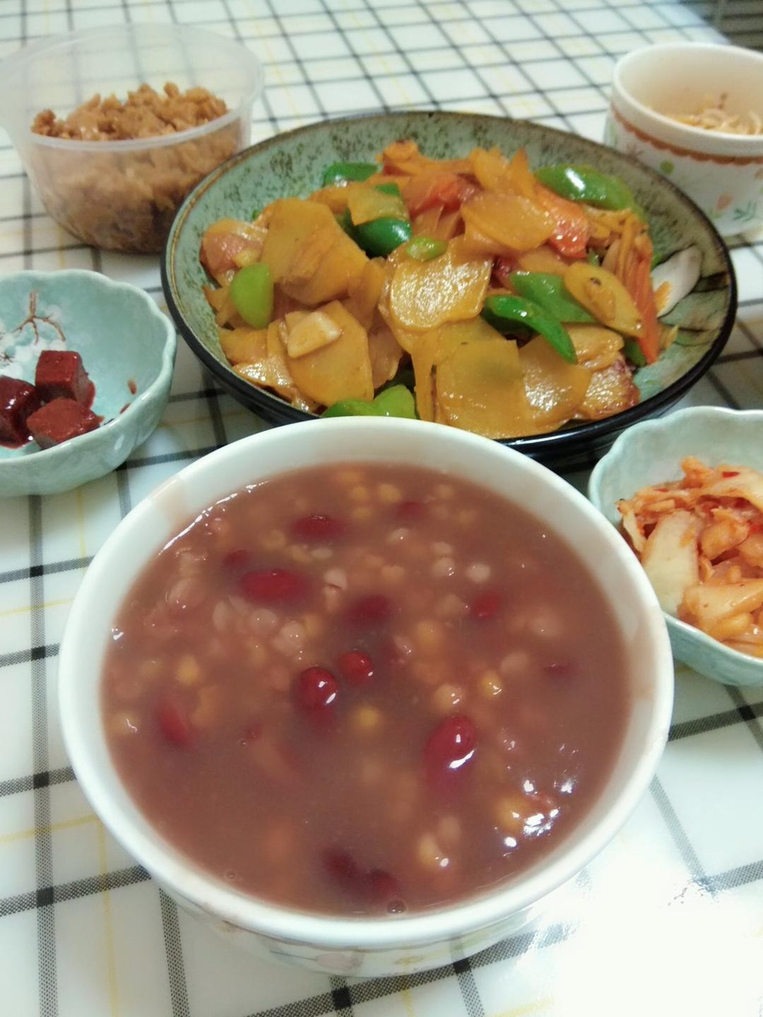 吃大碴粥 无需炒什么大菜 一盘辣白菜汁儿炒青椒土豆片 一碟拌咸萝卜干...