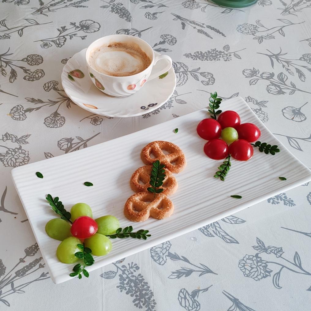 下午茶:橙子切片摆朵花,曲奇+青提,咖啡。