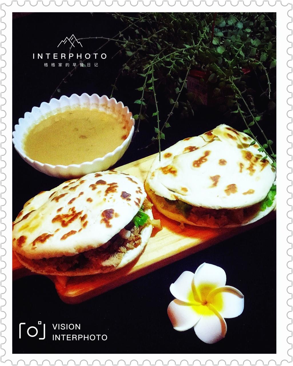 肉夹馍🥙,牛奶麦片粥🥣。馍还是杆薄了点。