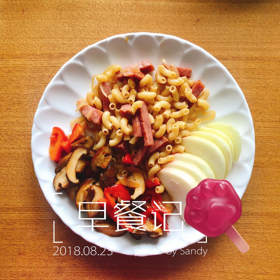 火腿炒意面,彩椒炒香菇,苹果半个