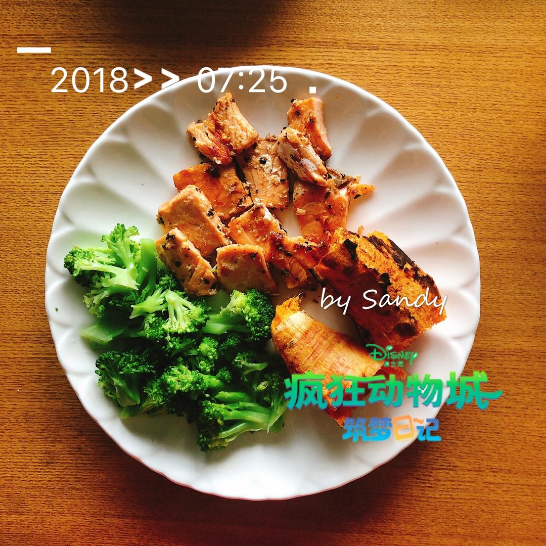 煎三文鱼,煮西兰花,烤红薯