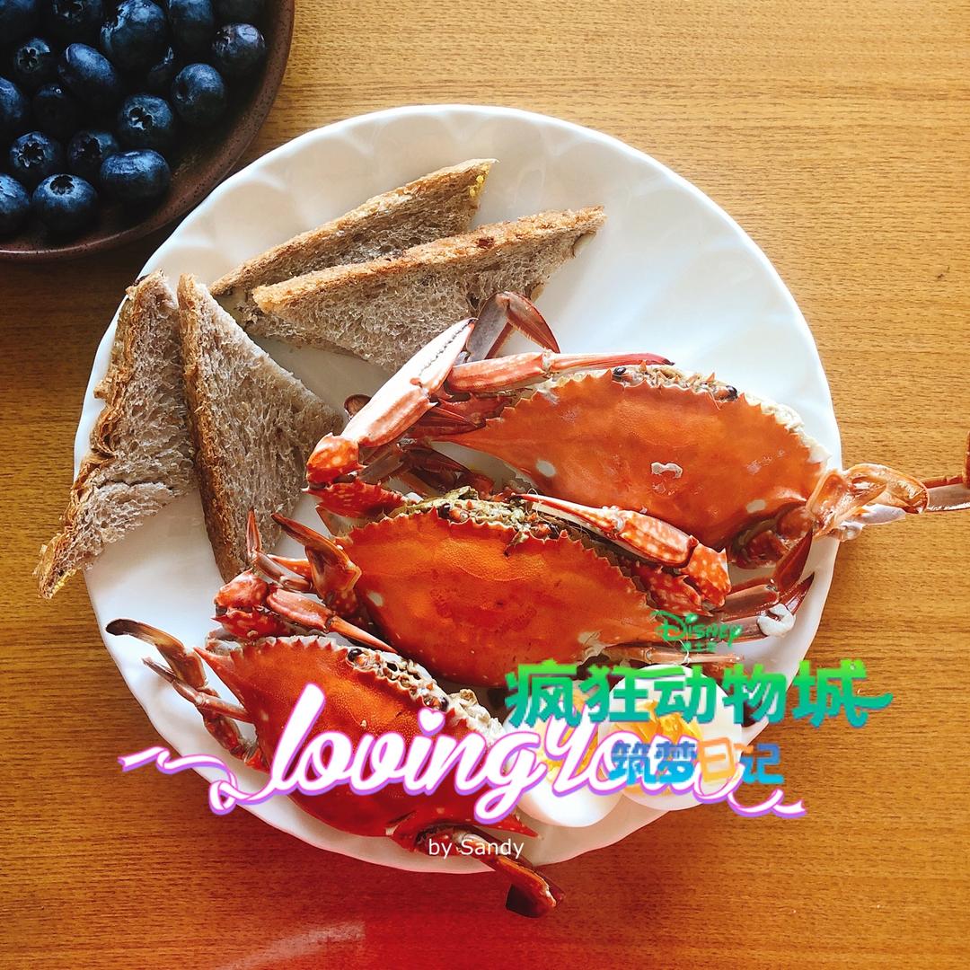 蛋白质清晨:螃蟹,煮鸡蛋,全麦面包,蓝莓
