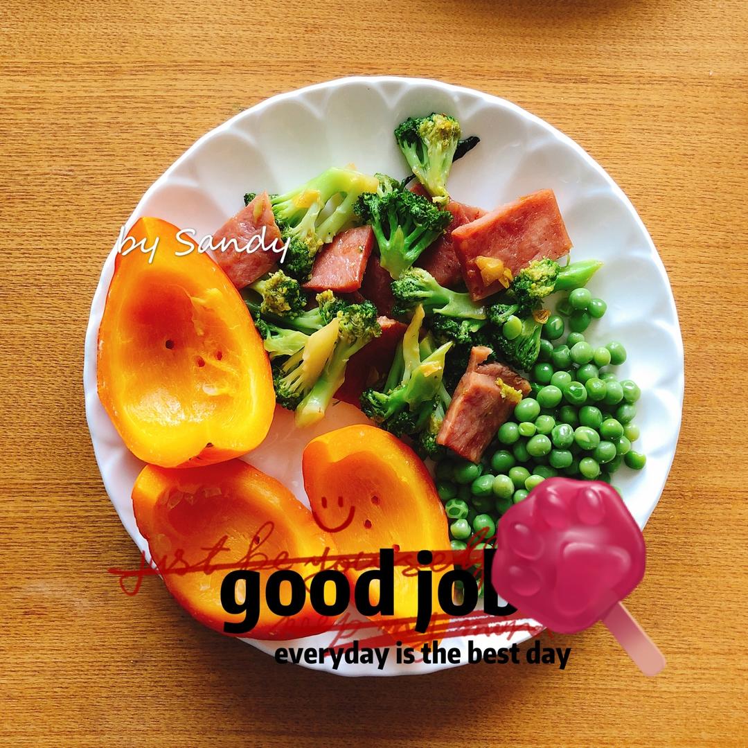 火腿炒西兰花,青豆,蒸南瓜。雨过天晴咯~