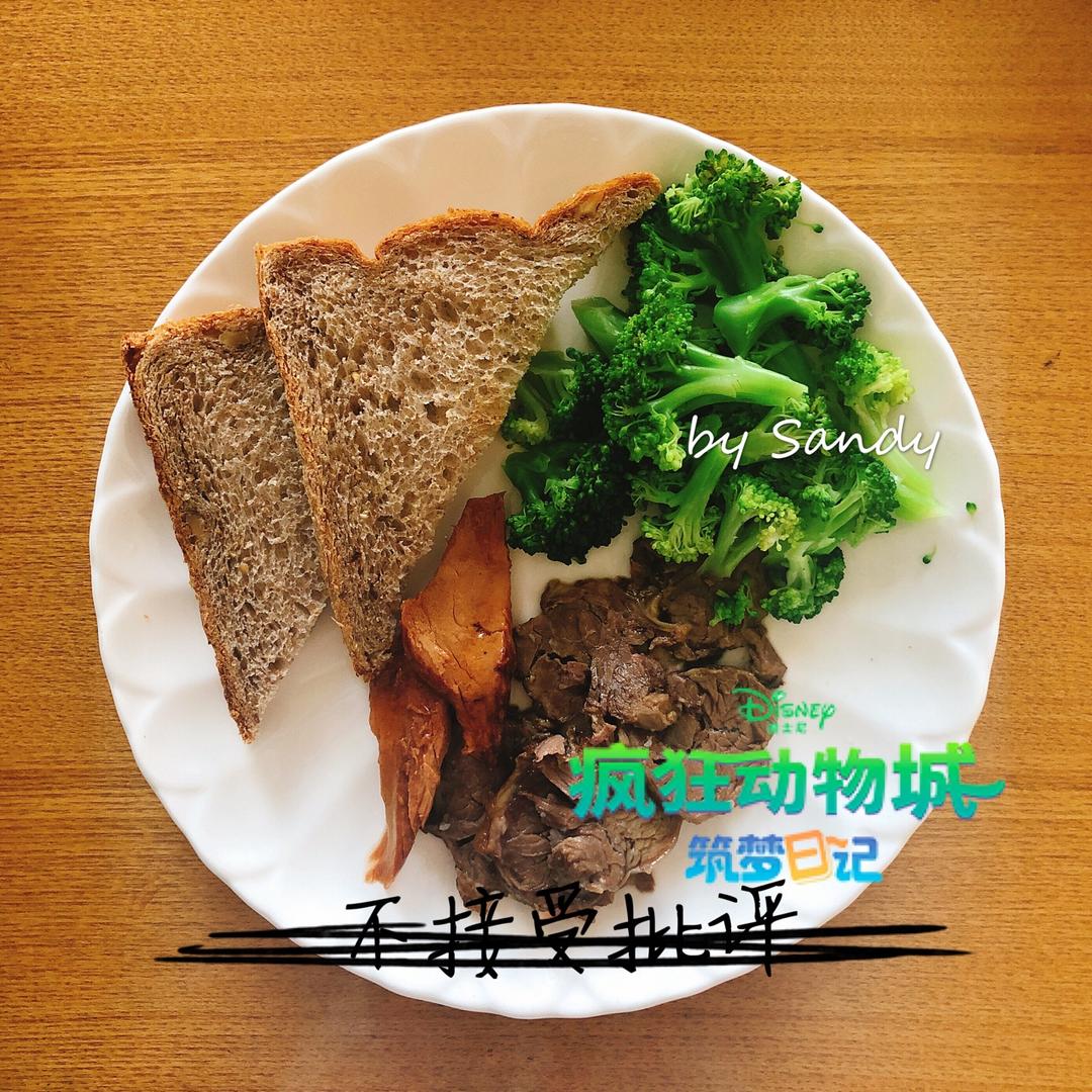 酱牛肉,金枪鱼罐头两块,水煮西兰花,全麦面包
