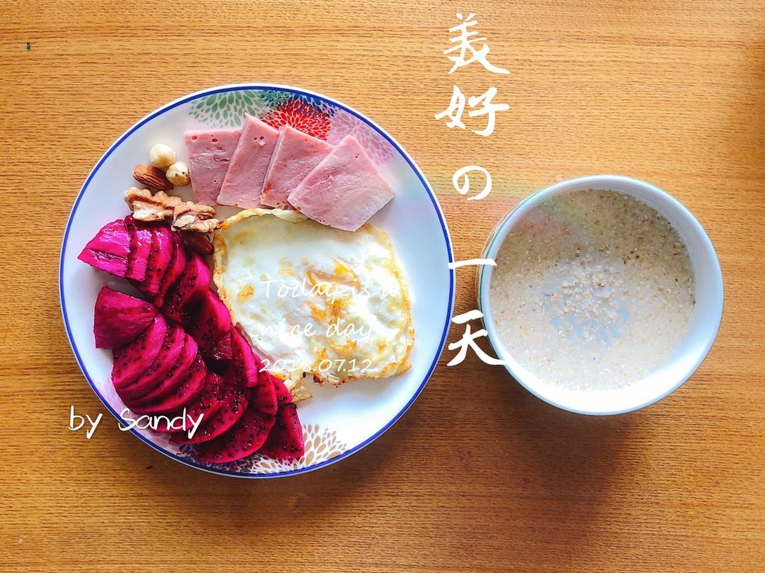 火腿,混合坚果,煎蛋,红心火龙果,脱脂牛奶,燕麦麸皮