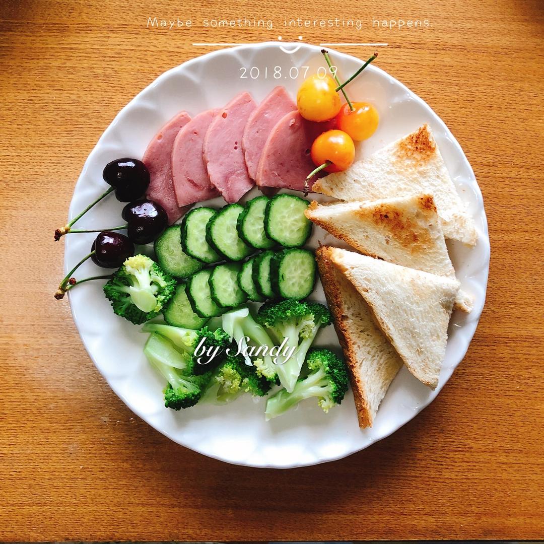 老公把脚崴了……黄瓜片,火腿片,西兰花煮好,全麦面包,最后的樱桃~