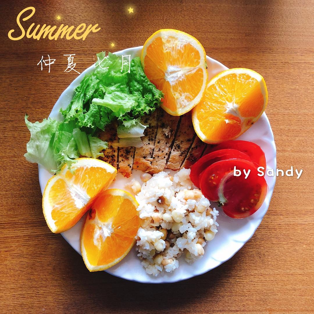 煎鸡胸肉,生菜,西红柿,橙子,玉米饭