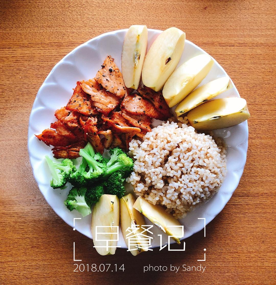 糙米饭,西兰花,煎三文鱼,苹果