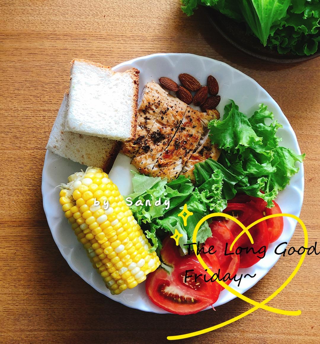 全麦面包,甜玉米,生菜,煎鸡胸肉,杏仁,西红柿